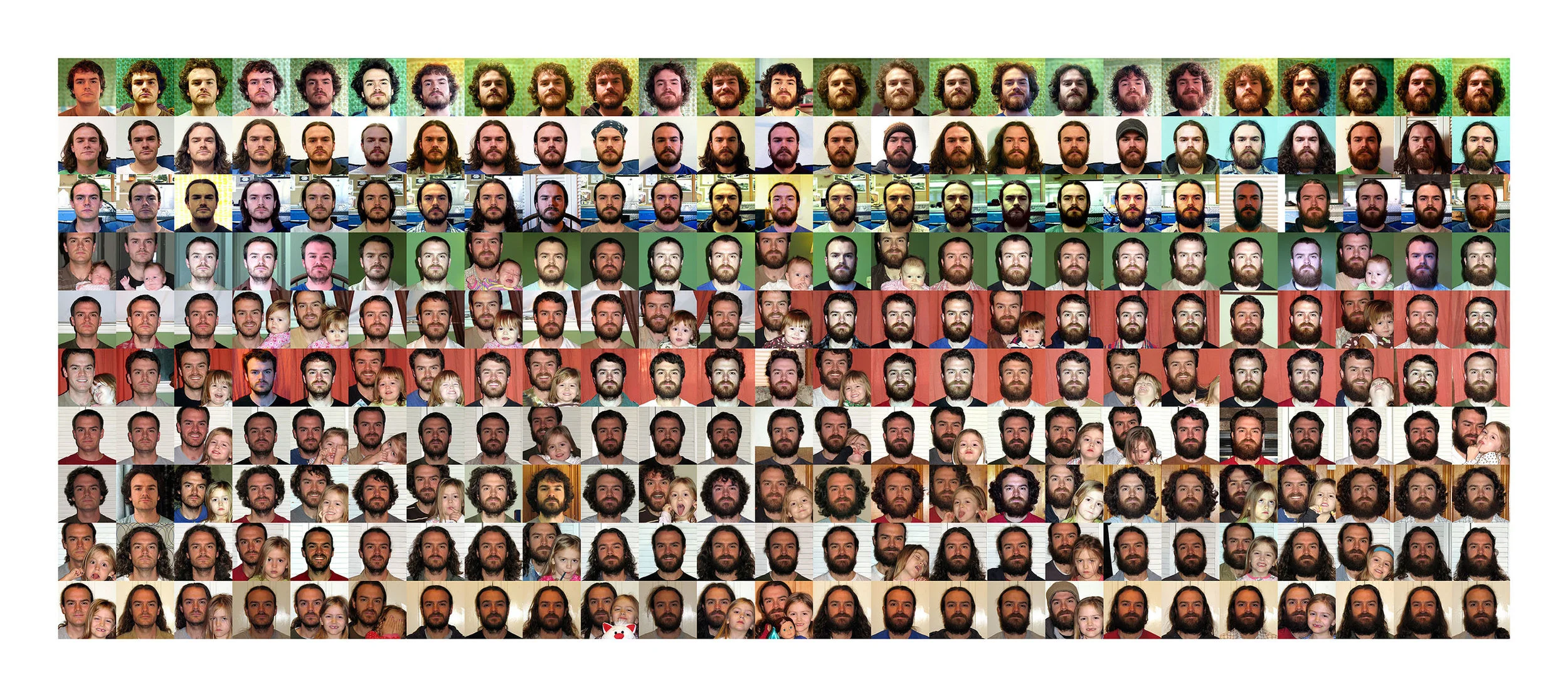 Every year from October 1st until April 1st, I grew my beard, documenting the progression with one photo every week. At the end of each six month period, I glued all of my facial hair together and shaved it off in one piece. This ten-year project was begun in the fall of 2004 and continued until the spring of 2014. The final display includes all ten beards and the 250-photo documentary grid.